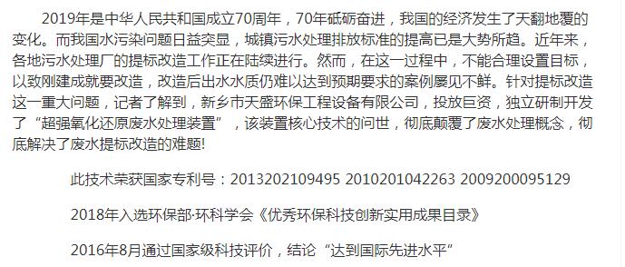 中國高新技術網發(fā)布:《關注:解碼科技創(chuàng)新》——新鄉(xiāng)市天盛環(huán)保“超強氧化還原廢水處理技術”